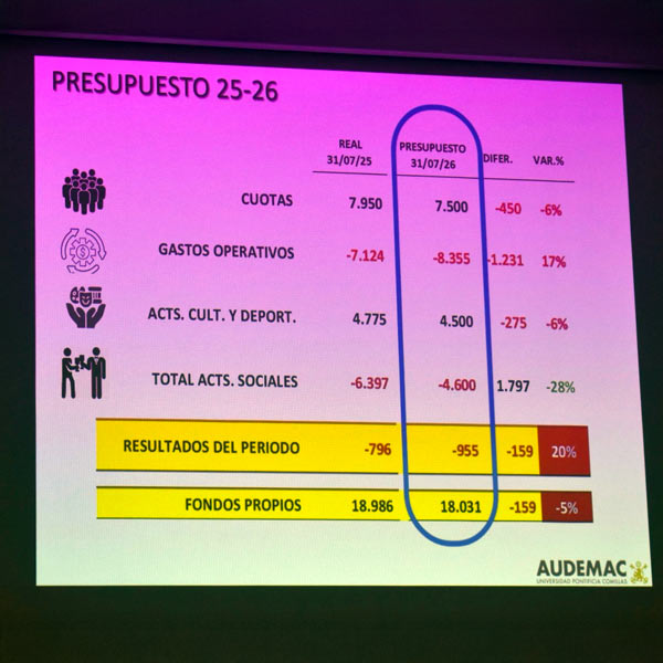 Conclusión: El presupuesto aprobado para el ejercicio 2025-2026 pone de manifiesto la existencia de desequilibrios financieros estructurales que debemos gestionar. Para ello la Junta Directiva analizará la puesta en marcha de medidas para incrementar los ingresos de manera que podamos asegurar la estabilidad financiera a largo plazo, sin tener que recurrir al fondo de tesorería.